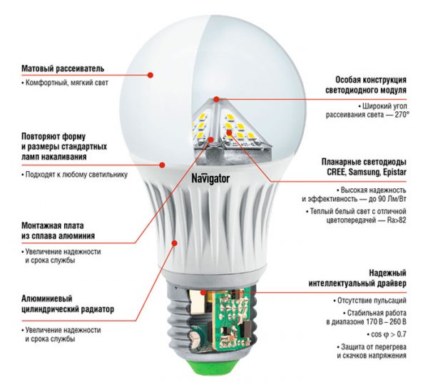 LED-лампочки имеют несколько более сложное внутреннее устройство в сравнении с обычными лампами накаливания.