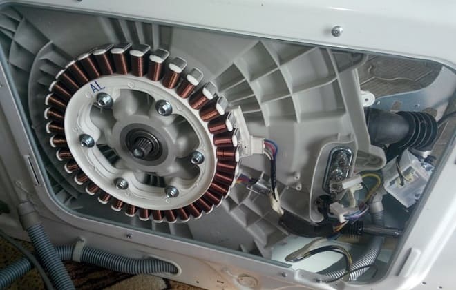 В машинках LG установлен современный асинхронный двигатель, который выпускает обратно пики тока или же провалы тока. Фильтр улавливает их и отправляет на резистор, который заземляет ток.