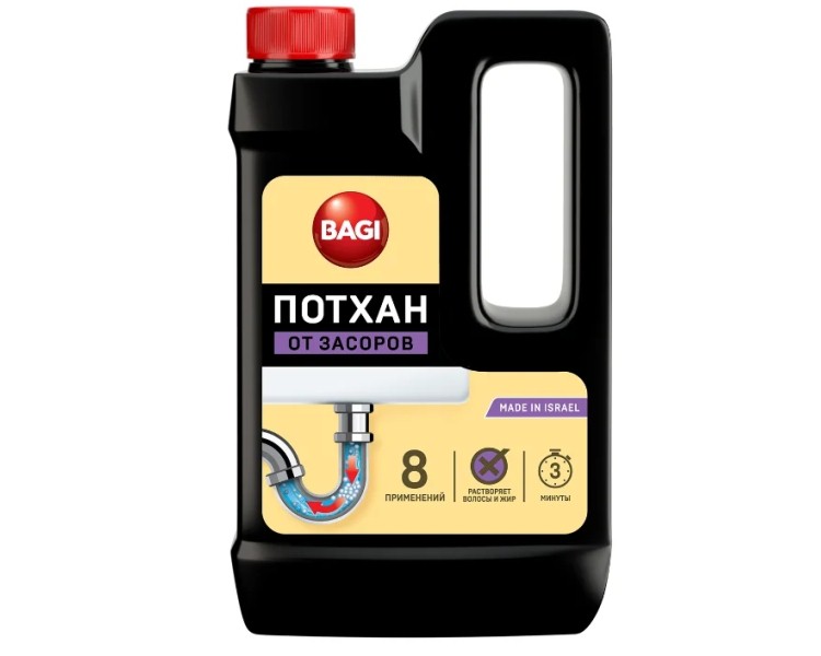 Средство Потхан – эффективное, оказывает агрессивное воздействие, растворяя не только пищевые отходы в трубах, но и волосы, и даже подгузники. Используется Bagi для прочистки засоров в металлических и пластиковых трубах. Время воздействия – 3 минуты. Превышать его не следует.
