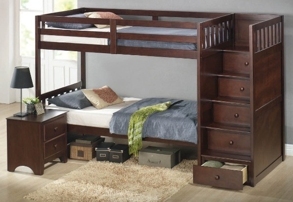 Двухъярусные кровати позволяют заполнить обычно пустующее место в углу и скрыть дефекты поверхности. Спальные места также могут быть расположены как друг над другом, так и перпендикулярно. Лестница на второй ярус может быть классической конструкции или же иметь ящики-ступеньки.