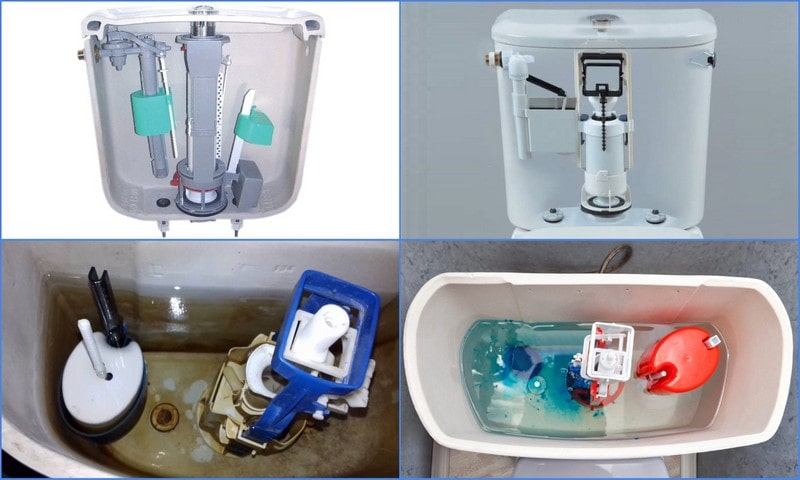 Существует две разновидности сливных бачков по точкам подводки воды – с боковой (старые классические модели) и нижней справа или слева (в основном современные модификации, приборы с инсталляцией), от конструкции нередко зависит и тип запирающего водоподачу механизма. При боковой подводке поплавок закрепляют на металлическом шкиве или вертикальной колонне, соединенными с запорным поршнем. В конструкции с нижней водоподачей используют легкий пластиковый стакан, перемещающийся по вертикальной штанге.