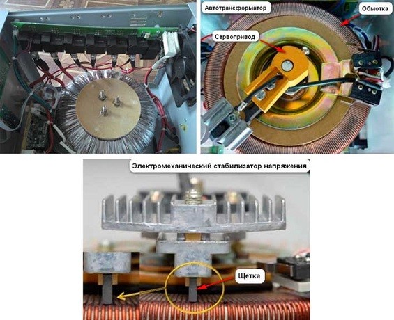 Работа электромеханических устройств основана на сервоприводе, который способен изменять количество витков обмотки (а значит – и выходящее напряжение) перемещением токопроводящего ползунка по реостату. Такие аппараты дешевле всех других моделей, и обладают очень хорошими показателями стабилизации. Однако они чаще ломаются из-за наличия множества механических деталей.