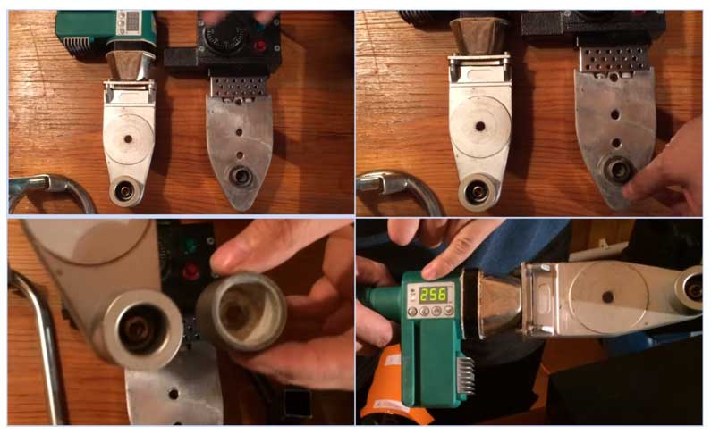 Для работы используют специальный сварочный аппарат для полипропиленовых труб. На его плоский нагревательный элемент, называемый «утюгом», крепятся парные втулки-переходники под диаметр трубы. Кромки деталей, подлежащие спайке, обрезаются ровно под 90о, с них снимается фаска, облегчающая соединение.