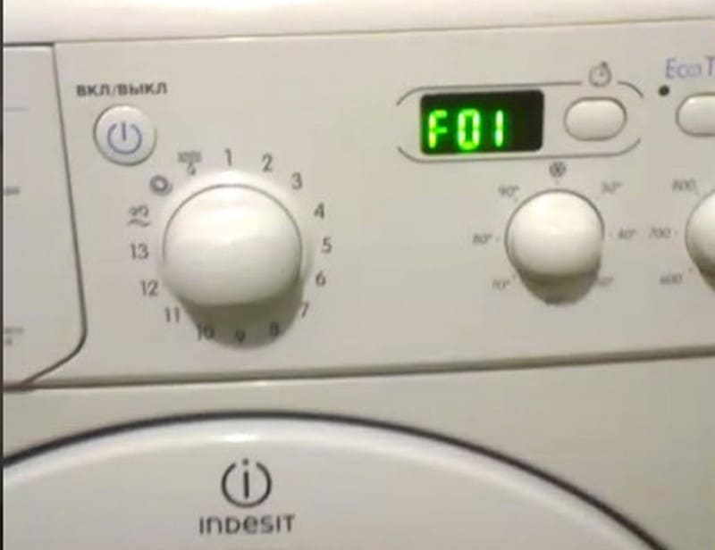 Если на дисплее стиральной машины марки Indesit вы видите ошибку с кодом F01, значит, электрический мотор имеет какую-либо неполадку. Вследствие этого на электронном блоке происходит замыкание соответствующего управляющего компонента, из-за чего начинают мигать лампочки и появляется ошибка. Это и есть расшифровка неисправности Ф01. Среди основных признаков и причин неполадки можно выделить следующие: