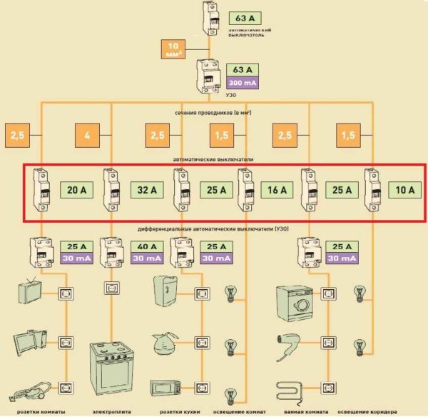 Малые номиналы — 10 А и 16 А — ставят на линии освещения, средние — на мощных потребителей и розеточные группы, а мощные — 40 А и выше — в основном используют как вводный (общий) дифавтомат. Подбирается в зависимости от сечения кабеля, точно также, как при выборе номинала автомата защиты.