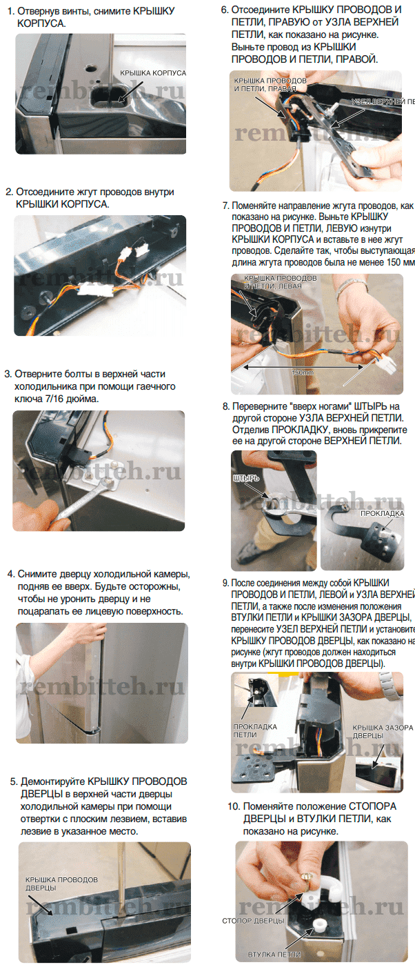 Дальнейшие действия аналогичны описанным в предыдущей инструкции. Демонтируется петельный механизм. Затем все действия повторяются в обратной последовательности. Самый последний шаг — подключение к разъему кабеля, выведенного с другой стороны. После этого накрепко затягивается крепеж петли. Устанавливается снятая ранее крышка двери холодильного агрегата. Монтируются на место декоративная панель и заглушки.