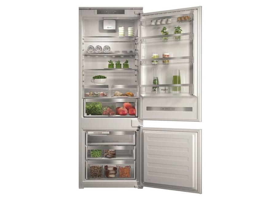 Практичная модель встраиваемого холодильника, которая оборудована маленькой (на 14 литров) морозилкой, установленной сверху. Хороший вариант для установки в студии, так как уровень шума от работающего компрессора не превышает 35 дБ. Управление электронное, панель находится внутри, рядом с лампочкой подсветки. Есть карманы на дверце перевешиваемого типа, четыре полки, пластиковый выдвижной ящик для хранения овощей, фруктов и других подобных продуктов. Морозильный отсек размораживается вручную, а холодильный оснащен капельной системой со своевременным выводом конденсата.