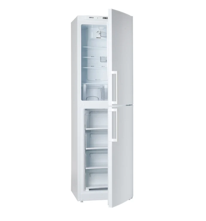 Однокомпрессорный холодильник с размерами 59,5 х 62,5 х 196,5 см. Имеет лаконичный дизайн, полки выполнены из прочного стекла, которое выдерживает большой вес. Полезный объем — 307 л, 225 л приходится на холодильный отдел, 82 л на морозилку. Здесь размещены реальные отзывы покупателей холодильников Атлант — рекомендуем ознакомиться