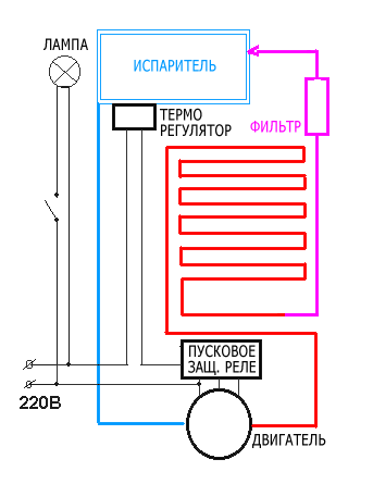 При включении питания, электрический ток через контакты терморегулятора и реле тепловой защиты поступает на обмотку электродвигателя компрессора. После включения контактов пускового реле, в следствии превышении номинального тока, к цепи подключается пусковая обмотка электродвигателя. Электродвигатель начинает вращаться и ток в рабочей обмотке снижается до своего номинала. После этого, контакты пускового реле вновь размыкаются, и электродвигатель компрессора продолжает работать в нормальном режиме. Когда температура фреона в испарителе достигает заданного терморегулятором значения, его контакты размыкаются, и электродвигатель компрессора останавливается. После того, как температура в холодильнике увеличится, терморегулятор вновь включает электродвигатель, и цикл повторяется сначала. Защитное реле служит для отключения электродвигателя, в случаи его перегрева. Оно состоит из биметаллической пластины, которая при повышении температуры изгибается и размыкает контакты, размыкая электрическую цепь. После остывания электродвигателя и биметаллической пластины контакты вновь замыкаются, и на схему подается питающее напряжение. В большинстве доступных двухкамерных моделей общий фреоновый контур: после прохождения по испарителю морозильной камеры, хладагент направляется в основную камеру, а лишь оттуда – в компрессор.