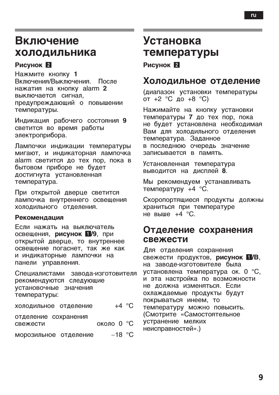Температуры, Холодильное отделение, Отделение сохранения свежести, Включение холодильника, Установка температуры