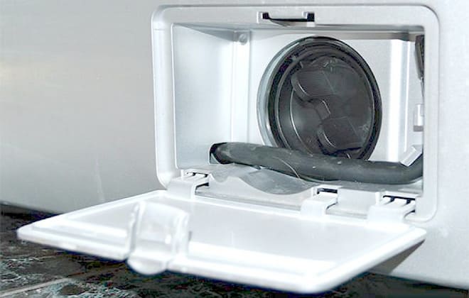 Шаг 1 | Откройте дверцу стиральной машины и найдите фильтр. Обычно фильтр расположен внизу передней панели. |