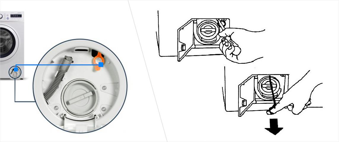 После выведения жидкости отсоединяется и прочищается сливной шланг. Произведя все манипуляции, стоит снова запустить режим полоскания. Если перечисленные действия не помогают, можно открыть дверцу с помощью аварийного троса красного или оранжевого цвета. Он располагается рядом с мусорным фильтром. В некоторых моделях эта деталь отсутствует, поэтому нужно действовать следующим образом: