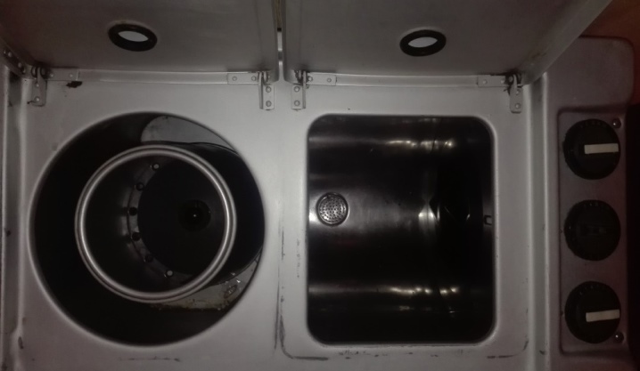 Во время рабочего процесса испачканные вещи помещают в первый бак, а после окончания стирки перемещают во второй, где они отжимаются.