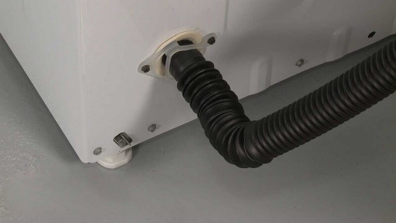 - Поднимите машинку на подиум и отсоедините сливной шланг от канализации. Если опустить его в таз, поставленный ниже уровня стиралки, вода из бака постепенно выйдет.