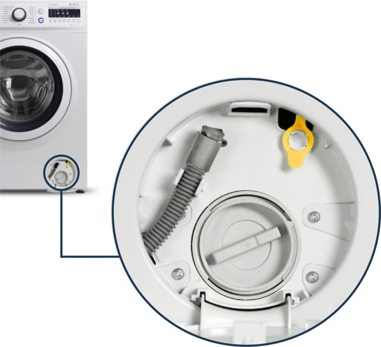 Многие современные СМА оснащены тросом экстренного открытия дверцы. Его конец располагается в лючке рядом со сливным фильтром. Как правило, он имеет яркую окраску – красную, оранжевую, салатовую, жёлтую. Для принудительной разблокировки дверцы необходимо потянуть за тросик.