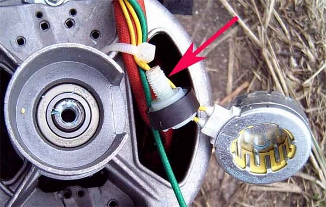 7. Тахогенератор снимается с мотора и проверяется омметром. При отсутствии неисправностей сопротивление будет в пределах 115 – 170 Ом. Точное значение указано в техническом описании. Быструю проверку таходатчика машинки Indesit можно производить без снятия движка. Датчик оборотов не подлежит ремонту, поэтому при большом отклонении значений сопротивления его меняют;