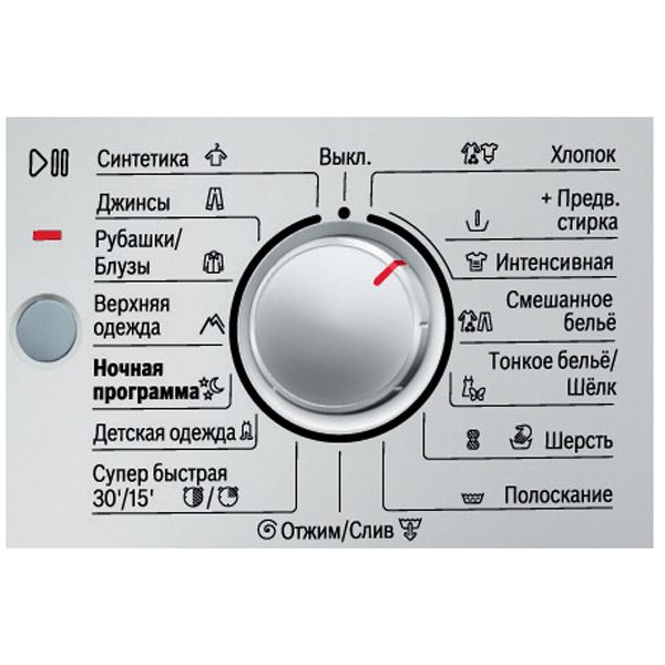 - «Ночной режим». Самая тихая программа. Чтобы не потревожить сон домочадцев, здесь не используются звуковые сигналы и отжим. Поэтому обязательно надо предусмотреть место, где сушить совершенно мокрые вещи, с которых будет капать вода. Стиральная машинка отключается автоматически. Позволяет сэкономить тем, у кого меняется тариф на воду (ночью – дешевле).