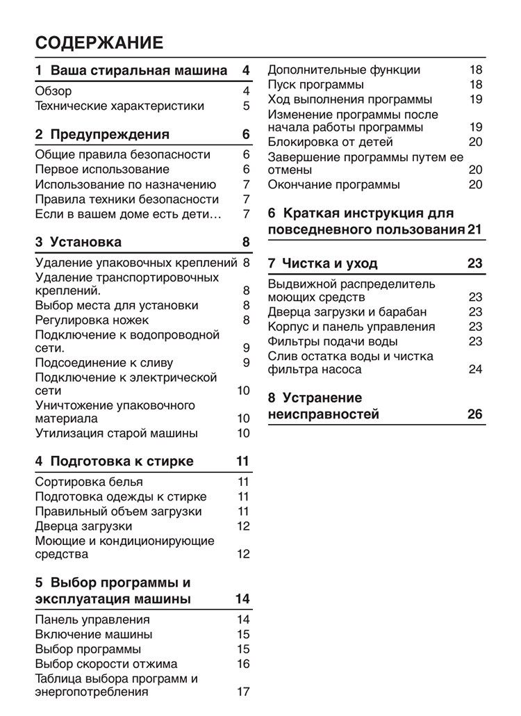 Инструкция к стиральной машине на 5, 6 или даже 8 кг содержит практически одинаковое количество пунктов, каждый из которых подробно рассказывает о правилах эксплуатации этого технически сложного продукта. Краткое содержание стандартной инструкции имеет следующий вид: