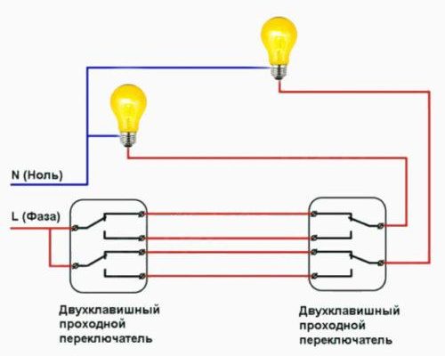 Схема управления освещением с двух мест При подключении двойных проходных выключателей удается управлять двумя лампочками поочередно из двух мест.