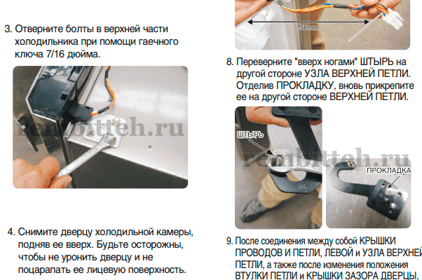 Как перевесить дверь холодильника на другую сторону Перед сменой положения створок двухкамерного прибора, необходимо выполнить следующие действия: отключить