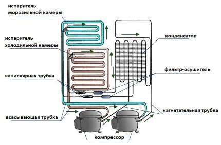 Устройство типового холодильника Компрессор своим давлением нагнетает фреон (охлаждающий агент) в конденсаторный узел. Там газообразный хладагент конденсируется