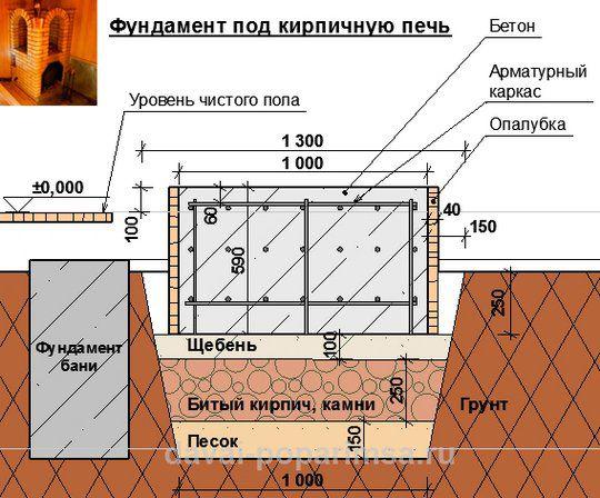 После составления проекта – определитесь с фундаментом. Кирпичная печь – это довольно массивное сооружение и ставить ее надо как минимум на ленточный фундамент, способный выдержать изрядный вес. При этом геометрические размеры фундамента рассчитываются исходя из предполагаемого веса кирпичной печи.