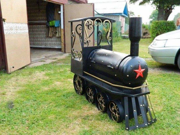 - Что касается декоративного оформления, то здесь также огромное поле деятельности. Что только не придумывают мастера. К примеру, вот такой вариант в виде паровоза, как на фото ниже. Определенно, такая конструкция украсит территорию дачи.