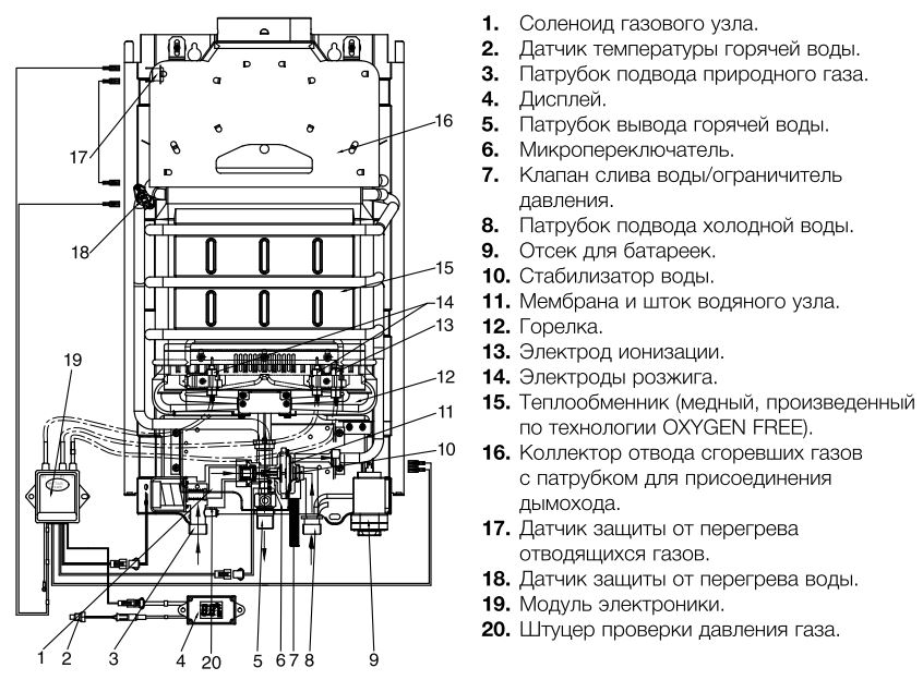 Водяное давление воздействует на мембрану, срабатывает запальник и горелка. Она нагревает теплообменник, по которому движется холодная вода. Вы открываете смеситель и получаете горячий поток.