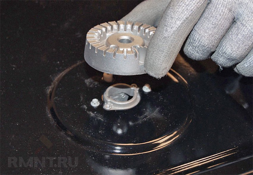 Замена жиклёров может выполняться двумя способами в зависимости от конструкции плиты. В простейшем варианте достаточно снять корпус горелки и заглянуть внутрь посадочной гильзы. Если на дне виден жиклёр — шестигранная головка с отверстием по центру — его выкручивают торцевым ключом на 7 или 8 мм и вкручивают сопло для замены. Если внутри виден конус с отверстием, придётся снять верхнюю панель, открутив несколько болтов на бортах с разных сторон. Сам жиклёр в таком варианте конструкции не выкручивается, он запрессован на сальниковых уплотнениях. Нужно разжать усы обжимной муфты, сдвинуть сопло вниз вместе с подводящей трубкой, а затем вытащить жиклёр с посадочного штуцера и установить новый.