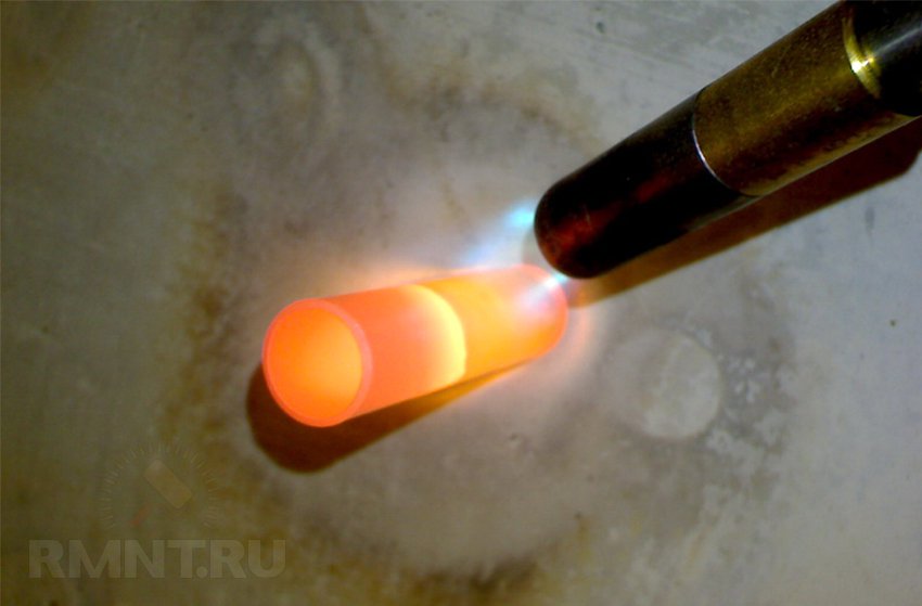 Пламя, разогретое до нужной температуры, направляется на зону сопряжения медных деталей, результатом чего является прочное неразъемное соединение трубы с трубой или с фитингом