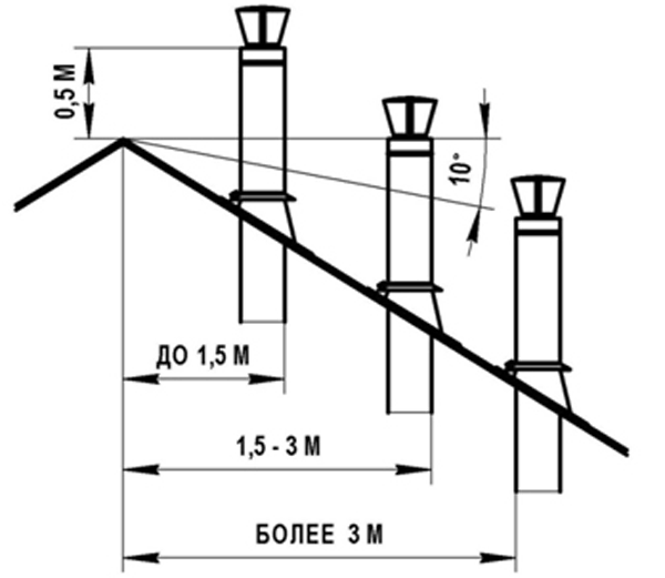 Высота (м)Условия0,5Плоская крыша1,5-3Не ниже самого конькаБолее 3Не ниже абстрактной черты от конька, при этом соблюдается угол в 10 градусов0,5Возвышение над пристройкой к обогреваемому помещению1-1,5Если материалы кровли огнестойкие