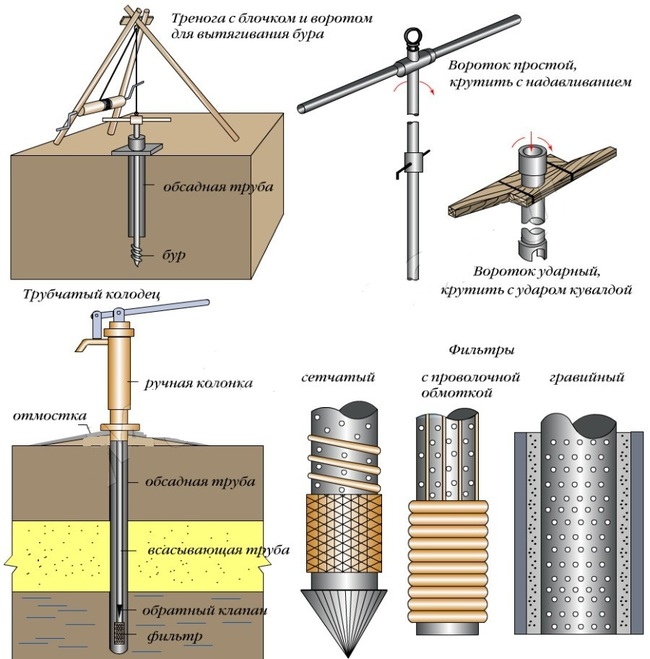 Основная часть собирается из водозаборной трубы, которая бурится в пласт с водой вглубь в среднем от 10 до 15 метров. Также сюда относится насосное оборудование или электростанция, которые крепятся сверху. В нижней части фильтрующий наконечник, через него происходит забор воды.