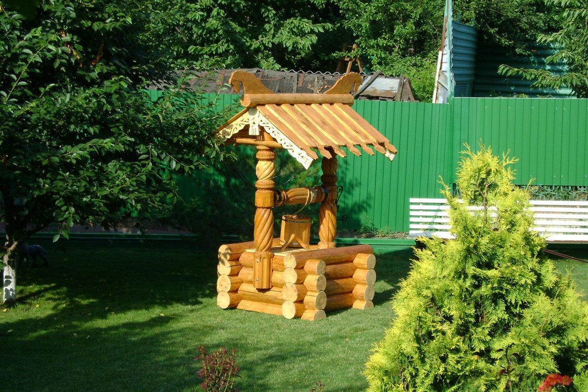Деревянный брус — это, можно сказать, русская классика. Он будет гармонировать с традиционным дачным домиком и станет украшением участка. Для отделки можно применять брёвна, доски, брусья. Часто из них сооружаются домики, которые дополнительно украшаются резными элементами. Такая конструкция выполняет не только декоративную, но и практическую функцию: защищает воду от загрязнений.
