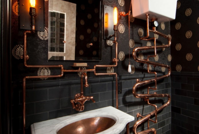 Еще один вариант из серии «выделить, нельзя убрать» — интеграция. Лучше всего этот номер проходит в стиле лофт, при этом трубы должны быть хромированными, медными или черными. Они одновременно будут служить декоративной и функциональной цели.