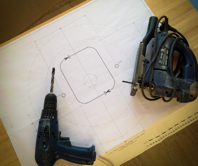 Шаг 2. Сверлят отверстия под крепежи, затем вырезают лобзиком отверстие под раковину и коммуникации.