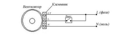 - Фазный провод сети подключается к входной клемме выключателя и к фазной жиле вентилятора.